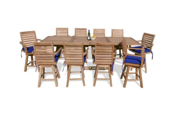 The Bimini Counter Height 108″ Rectangular Double Leaf Extension Table made with solid Grade A Teak will surely become a family heirloom. Has 2 hidden 19″ leafs and makes 3 different size tables. It’s 70″ long closed ..89″ long with one leaf up and 108″ long with both leafs up. Seats 10-12 people. The unique built-in butterfly pop-up leaf enables you to open or close your table in 15 seconds. Comes with cap covered umbrella hole. Some Assembly, Standard freight shipping.